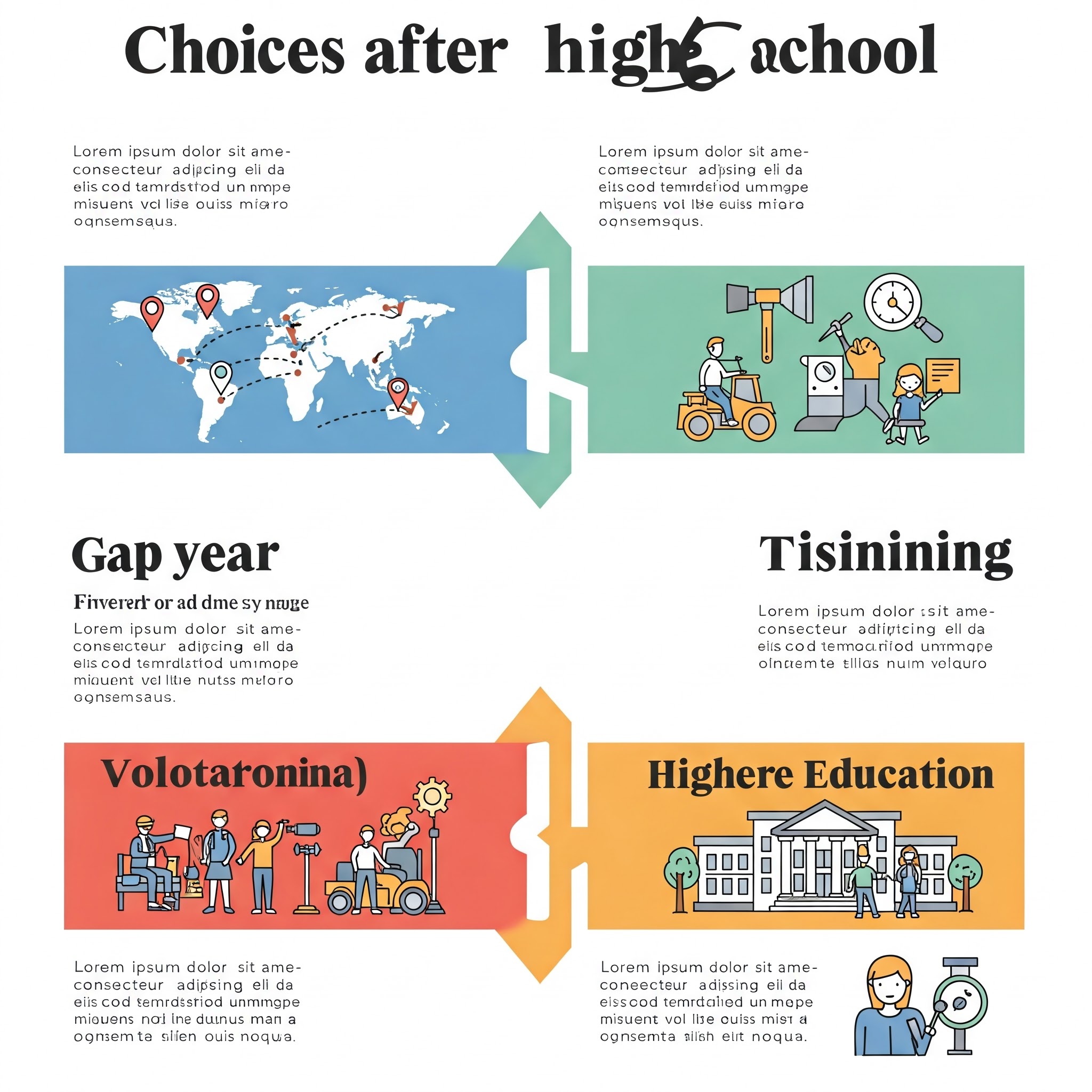 Sabbatåret giver mulighed for pause, oplevelser, arbejde og personlig afklaring, men kræver proaktivitet for at undgå stagnation. Erhvervsuddannelsen tilbyder en direkte vej til faglært status og jobmarkedet gennem en kombination af teori og praksis, og især EUX holder døren åben for videre akademiske studier. Den videregående uddannelse åbner for akademisk fordybelse og specialisering med henblik på en bred vifte af karrieremuligheder, men kræver en længere uddannelsesperiode og en høj grad af selvstændighed.