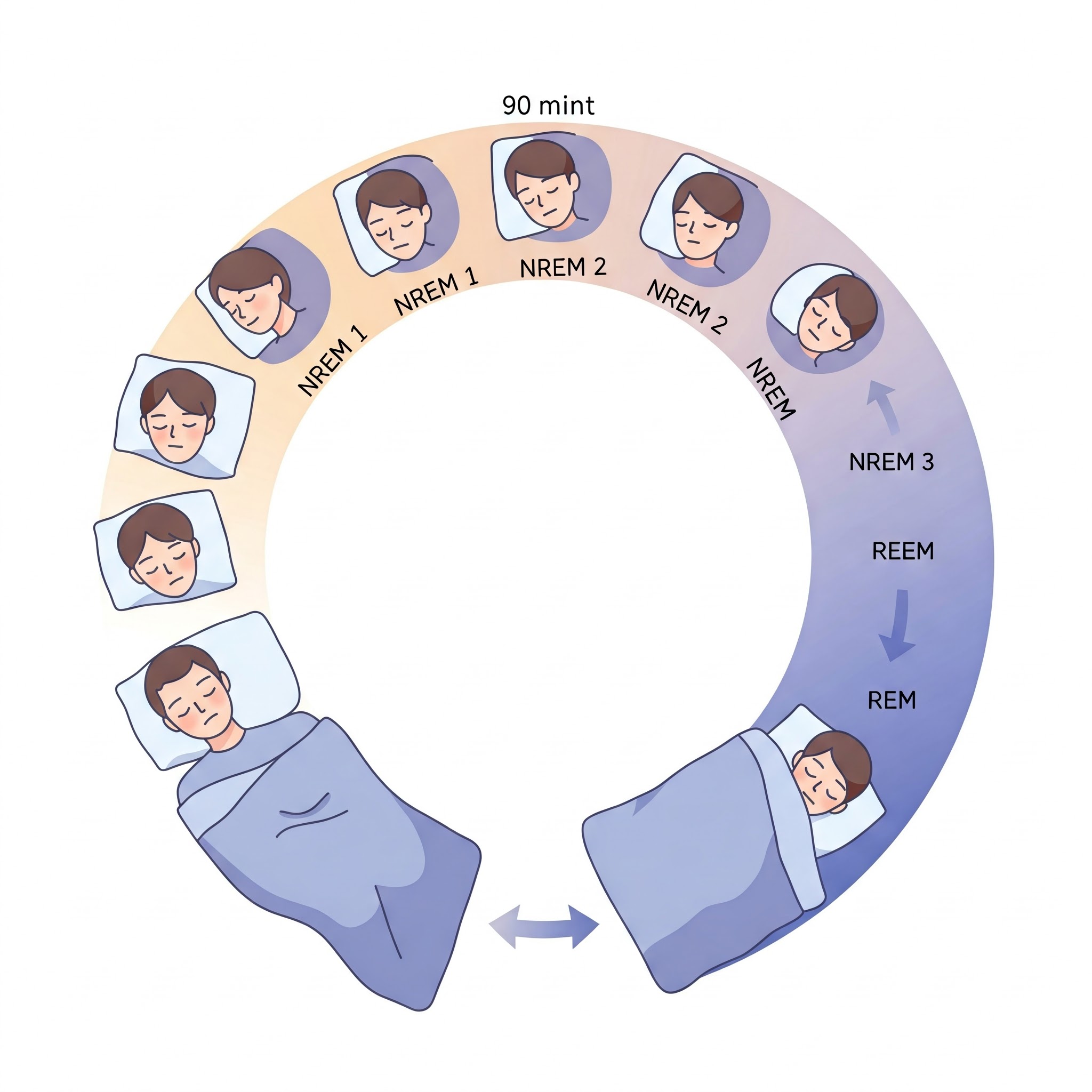 En søvncyklus består primært af to hovedtyper af søvn: NREM-søvn (Non-Rapid Eye Movement) og REM-søvn (Rapid Eye Movement). NREM-søvnen er yderligere opdelt i tre stadier, der gradvist bliver dybere.