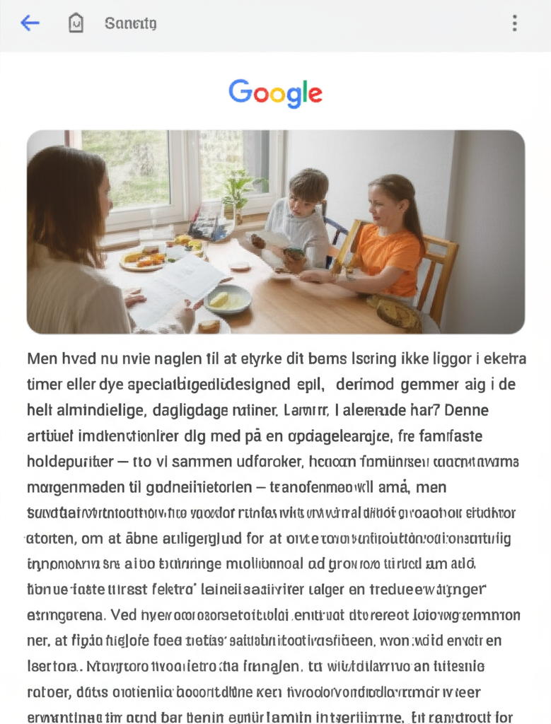 Fiktivt eksempel: Familien “Holm” har en fast tradition med “dagens ord” ved aftensmaden. Hver dag introducerer mor eller far et nyt, lidt udfordrende ord, forklarer dets betydning, og så prøver alle at bruge det i en sætning i løbet af måltidet. Det skaber sjove samtaler og udvider både børnenes og de voksnes ordforråd.